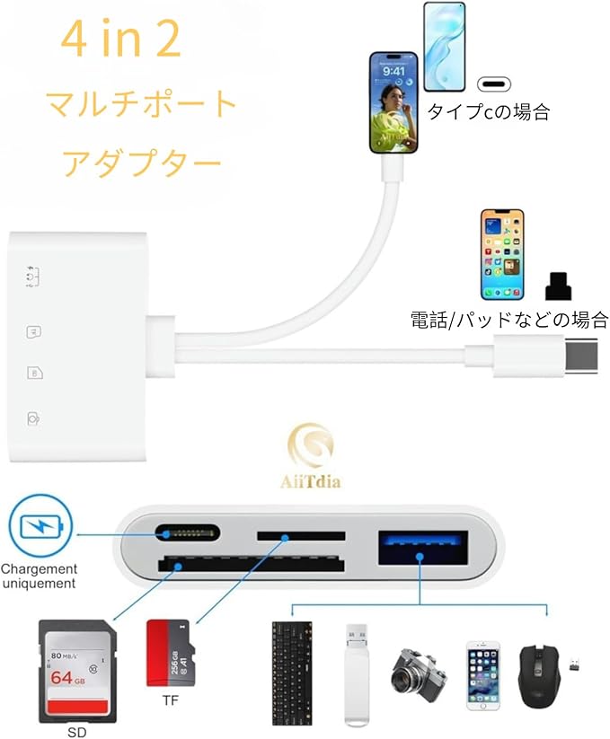 【4 in 2 iphone カードリーダー】このsdカードリーダーには「SDカードリーダー」(SD/SDHC/SDXC/RS-MMC/MMC-Microカード)「TFカードリーダー」と(Micro SD / Micro SDHC / Micro SDXCカード)、「usb 変換アダプタ」.1 つのカード リーダーで複数のニーズを満たすことができます。ファイルの転送、ビデオの読み取り、周辺機器の接続など、簡単に行うことができます。※TF/SD/USBが512GBまでごサポート。