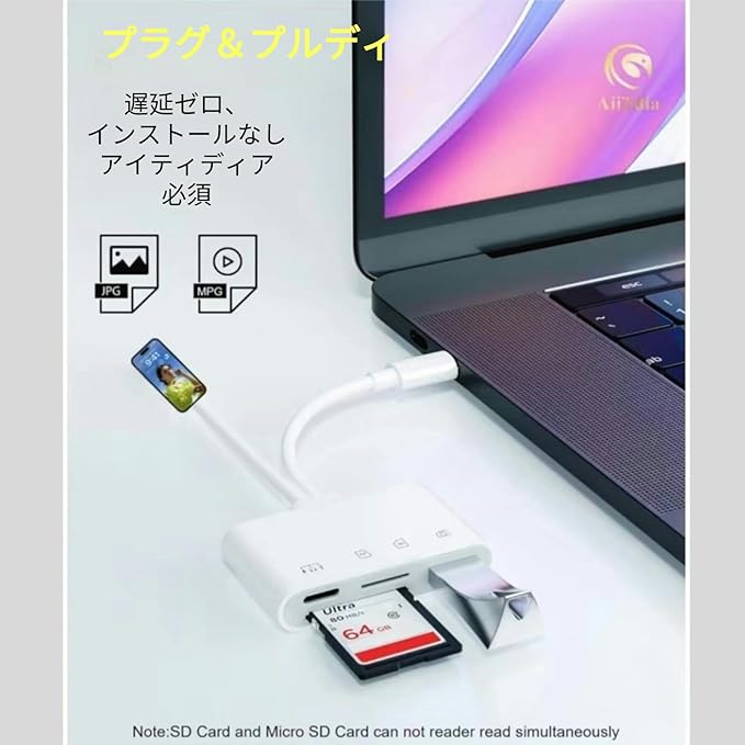 【簡単接続】APPなどの設定は不要で、リーダー本体にカードを挿入するだけで、IOSやUSB Cデバイスの写真やファイルを読み書きできる。挿入後、カードが反応するまで約5秒かかります。ファイルが表示できない場合は、カードリーダーを再度挿入してください。
