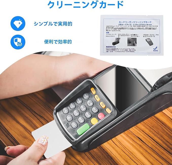 【幅広い機器対応のクリーニングカード】ETC 車載器(旧モデル含む)、クレジットカードリーダー、IC カードリーダー、POS 端末、ATMなど磁気カード・IC カードのスロット全般に対応。カードマシンクリーナーとして家庭用~業務用まで、多シーンで活用できるETC クリーニングカードです。