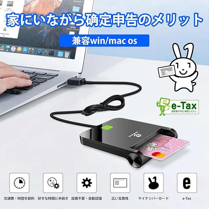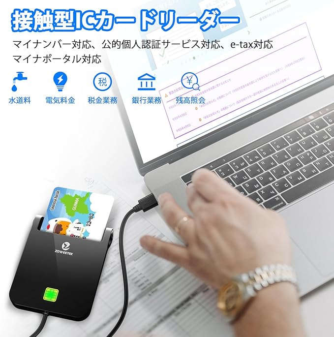 自宅で確定申告:ZOWEETEK icカードリーダー、パソコンに接続だけでカードの情報を読み取って公的個人認証を行えて、わざわざ外出せずにオンラインで確定申告書類作成、各種行政手続き。効率的なカードリーダーライタ、家にいながら簡単に確定申告書類を作成できました