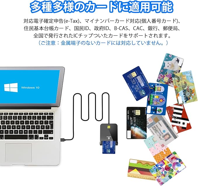 マイナンバー対応:icカードリーダー マイナンバーカード対応をはじめ、マイナポータル、電子申告e-Tax確定申告、住民基本台帳カードなどICチップ金属端子の付いたカードに適用しています