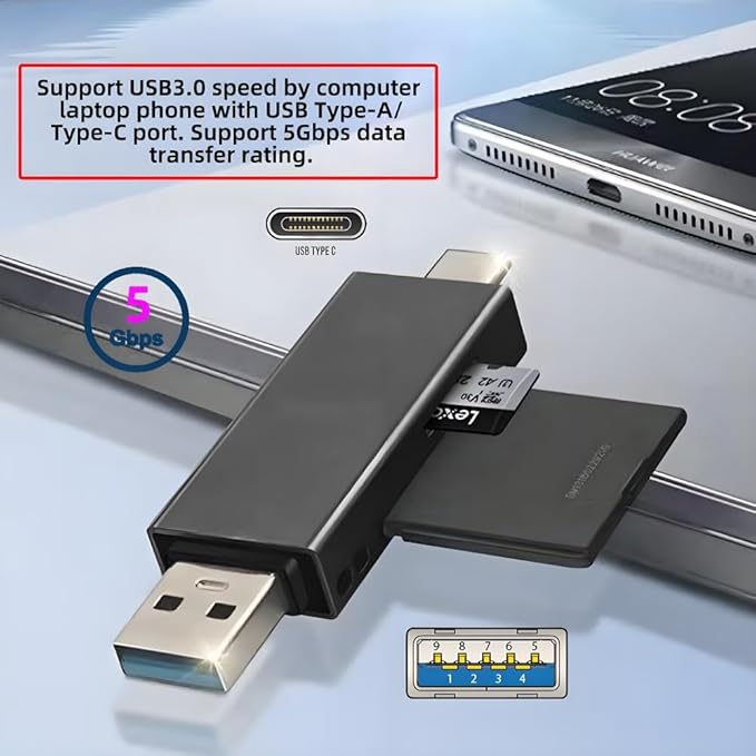 5)2-in-1カードリーダー。USB-AとType-C SDカードリーダーは、デュアルカードスロットとType-A/Cポートを備え、SD、microSD、USBデバイスから最大5Gbpsの速度で同時にデータ転送が可能です。写真、動画、ファイルを高速転送。デバイスを交換する必要はありません。