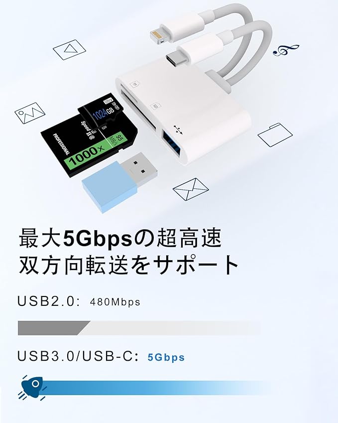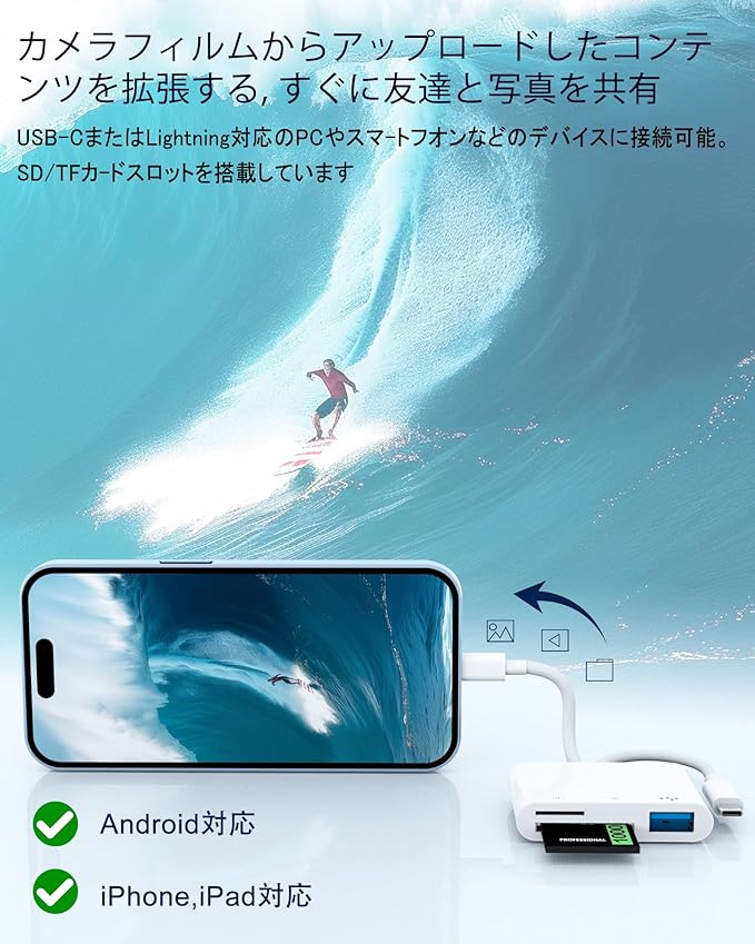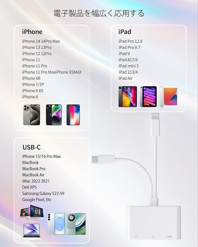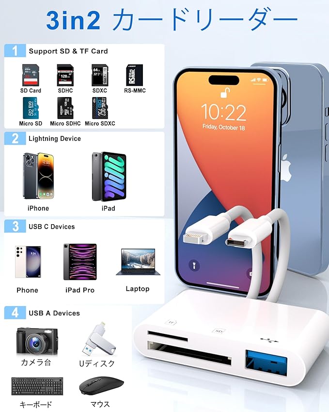 【幅広い互換性】マイクロsdカードリーダー iphoneはLightningとType-cポートを搭載し、iPhone/iPad/Android/Windows/Mac OS/IOSなど各種Type-CとLightningポートを搭載したデバイスに対応する。SDカードやマイクロSDカードに加え、USB AポートやUSB Cポートを搭載しているので、フラッシュドライブ、キーボード、マウス、マイク、ゲームコントローラーなどのUSB周辺機器を接続することができます。