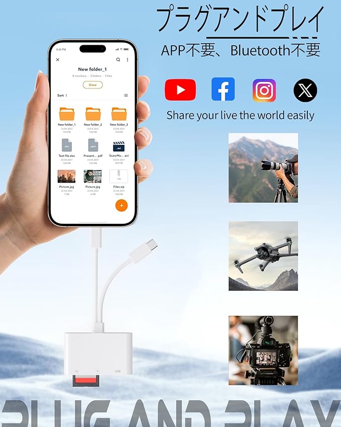 【簡単操作】APP、WIFI,Bluetoothなどは必要ありません。カードリーダーを接続するだけで、デジタルカメラで撮影した写真をスマートフォンやパソコンに簡単に転送できます。小型軽量でケーブルも短く、持ち運びが非常に容易です。OTGは機能を備えているので、パソコンがなくても、すぐにデータを転送できます!旅行中に家族や友人と大好きな写真や動画を共有したり、ソーシャルメディアアプリに投稿したりするのに最適です。出張中でも簡単にバッグに入れることができます。写真愛好家にとっては最高の選択だ。