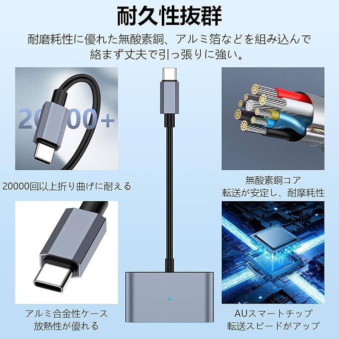 【高耐久・安心品質保証】このタイプc usb 変換は両端のコネクター部分にはアルミ製モールドを採用、耐久性・機能性だけでなく、見た目の質感にもこだわりました。20,000回の屈曲試験に耐える高耐久設計で、持ち運び時の衝撃や摩擦による断線のリスクを低減します。万が一ご使用いただいている製品に不具合と思われる事象が生じた場合、当該事象を弊社が不具合であると確認した後、同一製品との無償交換、又は製品返金等当社にて適切と判断する対応をお承り致します。