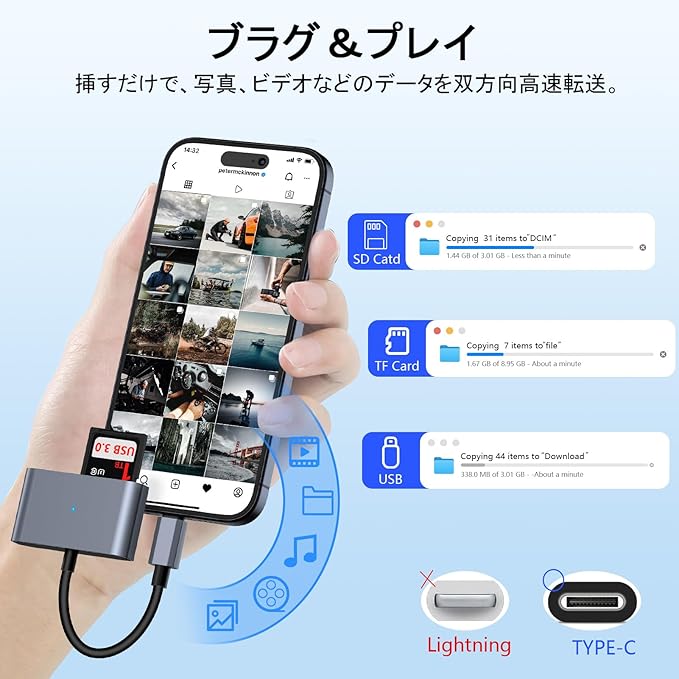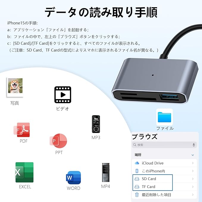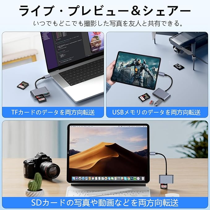 【新世代: 3-in-1カードリーダー】1*USB ポート + 1*SDポート(SD /SDHC/SDXC/MMC/RS-MMC)+1*TFポート(Micro SD/Micro SDHC/Micro SDXC)1が装備されています。1つのカードリーダーに複数の機能が搭載されています。様々なニーズに適用でき、いつでもどこでも写真や動画、ファイルを共有することができます。携帯電話の容量が足りなくなったり、写真が多すぎたりする心配の必要はありません。