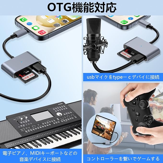 【双方向高速転送・USB3.0】このスマホ カードリーダーはUSB3.0基準で最大5120Mbpsの双方向データ転送を対応して、従来のUSB2.0より約10倍速でデータを送信できます。500の楽曲、1000枚写真、HD映画など数秒内で転送できます。いつでもスマホの容量を解放です。