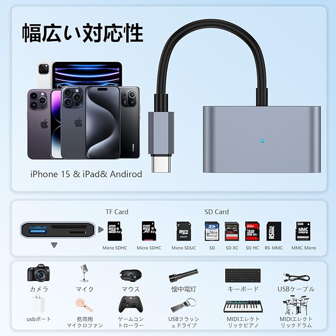 【幅広い互換性】■USB Type-Cポート対応機器:iPhone 16 / 16 Pro /16pro max/16 plus/ iPhone 15 / 15 Pro / iPad / Mac / Androidスマートフォン / Androidタブレット / パソコン。タブレットからusbアダプタまで標準の写真フォーマットやJPER、RAW、SD、hdビデオフォーマットに対応しています。カメラ、マウス、キーボード、USBメモリ、カードリーダーなど、USB周辺機器を接続することができます。USBカメラアダプタを介してPCのキーボードやマウスをUSB-Cデバイスに接続できます。