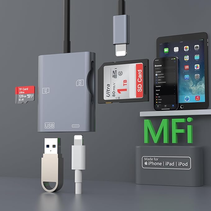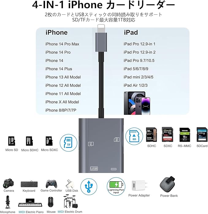 ⚡【4-in-1 SDカードリーダーiPhone】SDカードポート(SD/SDHC/SDXC/RS-MMMC/MMMC-Microカード)*1 TFカードポート(Micro SD/Micro SDHC/Micro SDXCカード)*1 Lightningポート*1(同時充電と転送)USBポート*1(マック、キーボド、サンドカド、マイク、電気オルガーンなど)複数のポート、多様なニーズを満たし、いつでもどこでも写真ビデオファイルなどを共有することができ、携帯電話の容量不足、写真が多すぎるなどの問題に悩む必要はない。