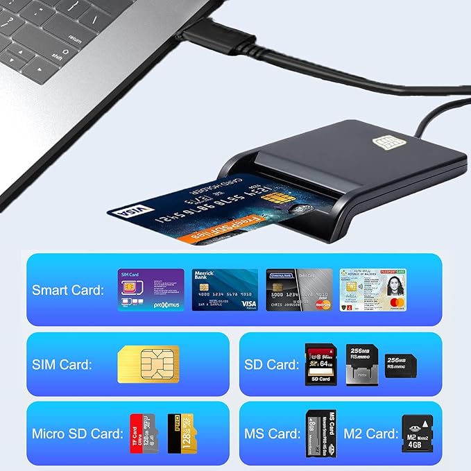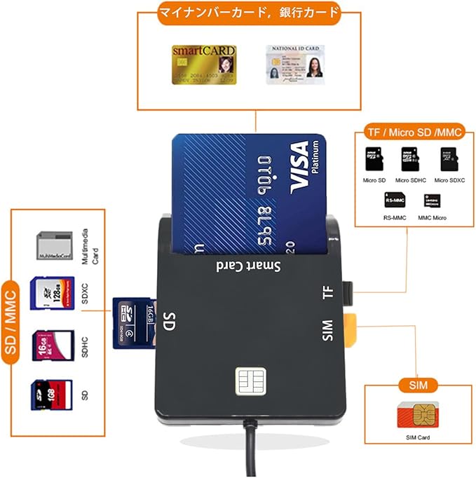 4in1 多機能カードリーダー:カードリーダー自体には4つのカードスロットがあり、Smart Cardカードスロットにはマイナンバーカード、銀行カード、クレジットカードを挿すことができる。SDカードスロットにはSDカード、MMCカードを挿すことができます。TFカードスロットはTF、Micro SD、MMCカードを挿すことができる。SIMカードスロットにSIMカードを挿すことができる。