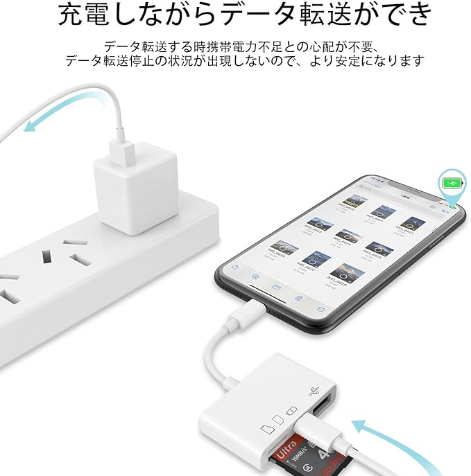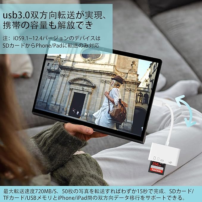 【急速充電&usb3.0双方向転送】電力不足の悩みがなくて、iPhoneやiPadがPD27Wの速度で充電しながらデータ転送ができます。このカードリーダーはiPhone/iPadとSDカード/TFカード/USBデバイスのデータ双方向移行が実現し、usb3.0の転送速度5Gbpsに達し、SD/TFポートの最大転送速度は720MB/秒(理論値)で、わずか数秒でデータ移行が完成でき、すぐに転送内容をご高覧になります。