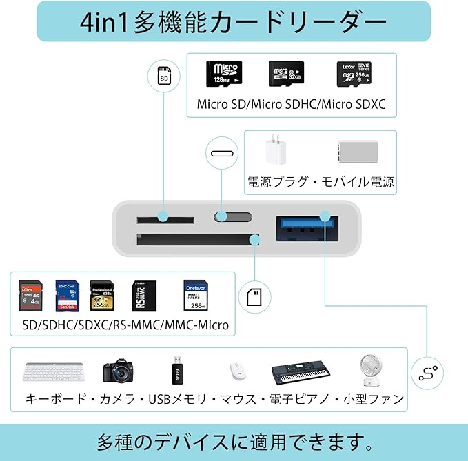 特徴 4in1多機能カードリーダー, コンパクト, プラグ&プレイ