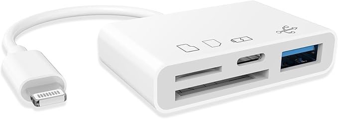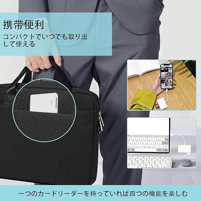 【4in1カードリーダー】一つのカードリーダーに四つのポートがあるため、複数のカードが同時に読み取れます。1*USBポート+ 1*SDポート(SD/SDHC/SDXC/MMC Micro/RS MMC)+ 1*TFポート(Micro SD/SDHC/SDXC)+ 1*ライトニングポートが搭載されています。数多くニーズに満足でき、一つを持っていれば四つの機能が楽しめます。iPhoneやiPadのメモリ不足の場合、Lightning to USB/SD/TF変換アダプタを通じて容量解放できます。