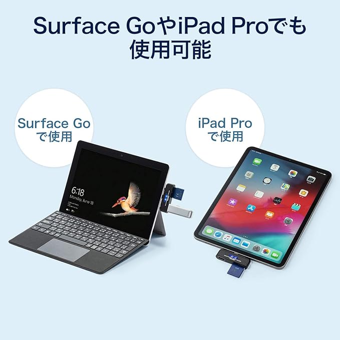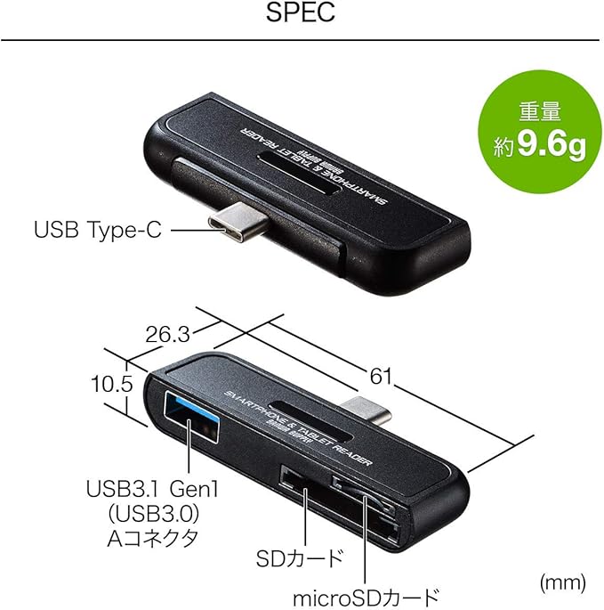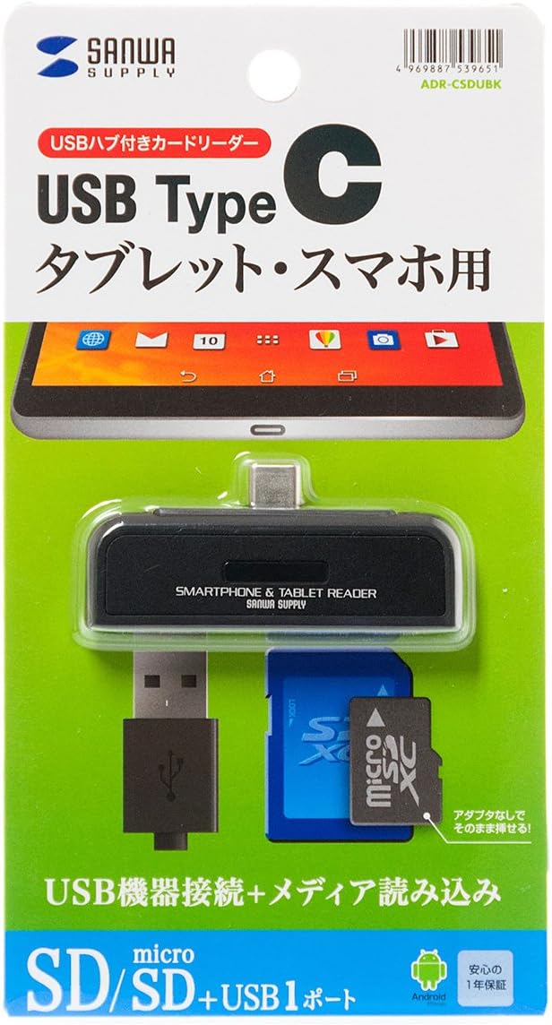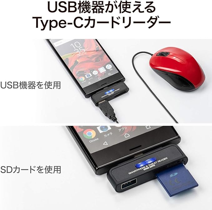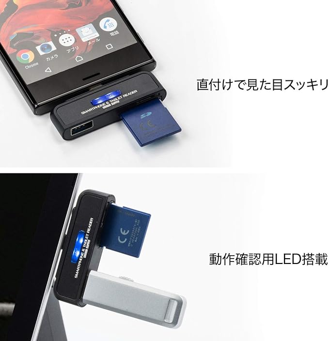 ・スマートフォンやタブレットのUSBホスト機能に対応したカードリーダーです。