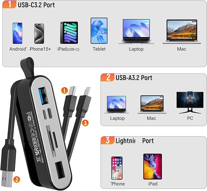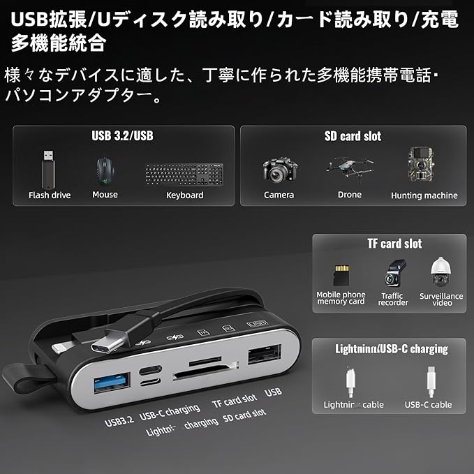 【6in3 カードリーダー】カードリーダーの3本のケーブル(ライトニング/Type-C/USBケーブル)は、あらゆる携帯電話/Pad/Android/PCデバイスで使用できる。SDカードポート(SD / SDHC / SDXC / RS-MMC / MMC- Microカード)+TFカードポート(Micro SD / Micro SDHC / Micro SDXCカード)+ライトニング/Type-C充電ポーinト+USB 3.0/2.0ポート*1。専用アプリやインターネット不要でデータ通信制限を気にすることなく、カードリーダーを接続するだけで、簡単にデジタルカメラで撮影した写真をスマホに転送できます。