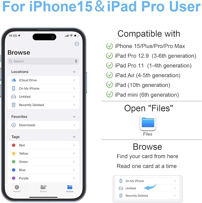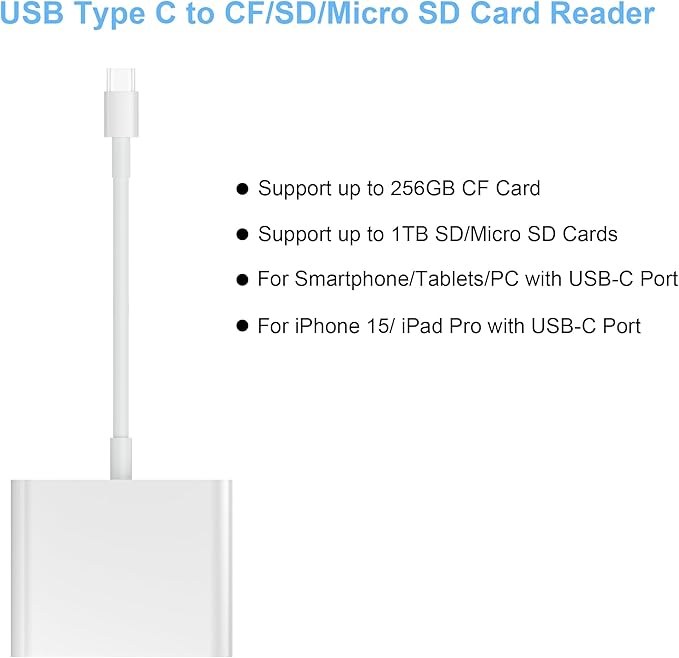 [幅広い互換性]: このUSB-C CFカードリーダーは、iPhone 15、iPhone 15 Plus、iPhone 15 Pro、iPhone 15 Pro Max、MacBook Pro 2021 M1/2019/2018/2017/2016、MacBook 2017/2016/2015、iPad Pro 2021 M1と互換性があります。 /2020 /2018、Surface Book 2、Samsung Galaxy S22/S21/S20/S10/S9/S8/Note 10/Note 8/Note 9、Pixelbook、Dell XPS 15 / XPS 13、Galaxy Tab S8/S7などのType Cデバイス。