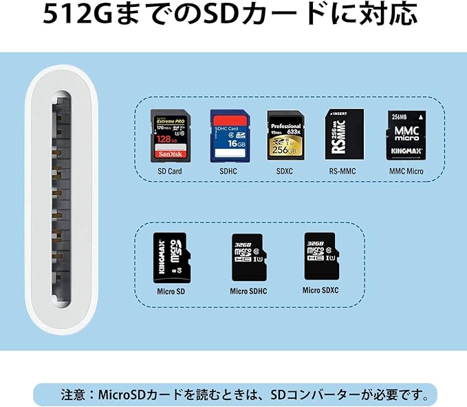 【最大容量512GB】512GまでのSDカードに対応して、端末の容量が少なくてもたくさんのデータを保存することができるので、プライベートやビジネスシーンでも活躍します。SD/SDHC/SDXC/RS-MMCカードをサポートしているだけでなく、アダプタ付きmicroSDカードもサポ ートしています。