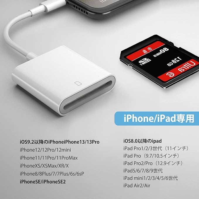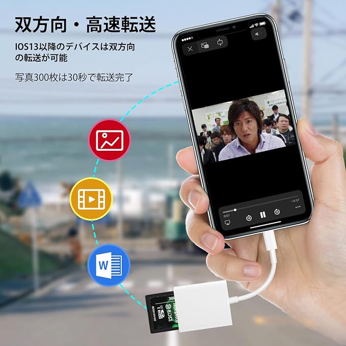 【双方向転送】iOSバージョン13以降であれば、iPhoneやiPadの容量を圧迫している写真や動画をSDカードに移行させて、容量不足が解決できます。 ファイルアプリから直接閲覧だけすることも可能です。また、デジカメやビデオカメラで撮影した画像を、iPhoneに転送できます。注意:システム9.2~12.4のiPhoneやiPadはSDカードからデバイスに転送聞きます。iPhone内のデータをSDカードに転送することはできません。
