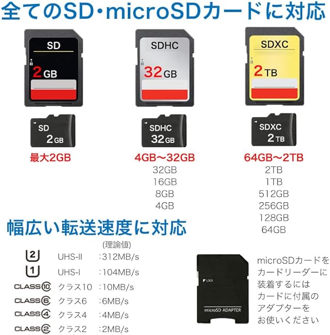 対応SDカード:SDXC(64GB~2TB)・SDHC(4GB~32GB)・SD(~2GB)・UHS-I(Ultra High Speed)
