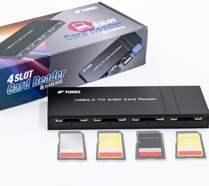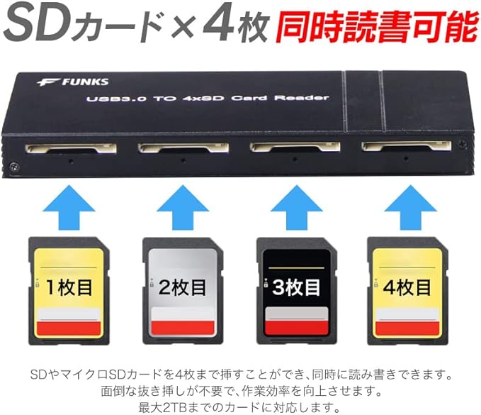 SDやマイクロSDカードを4枚まで挿すことができ、同時に読み書きできます。面倒な抜き挿しが不要で、作業効率を向上させます。最大2TBまでのカードに対応します。