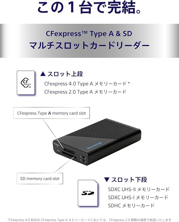 Nextorage 日本メーカー CFexpress Type Aメモリーカード/SDカード対応 マルチスロットカードリーダー USB 10Gbps USB3.2 Gen2 NX-MFA1SE ネクストレージ | KAZESHOP