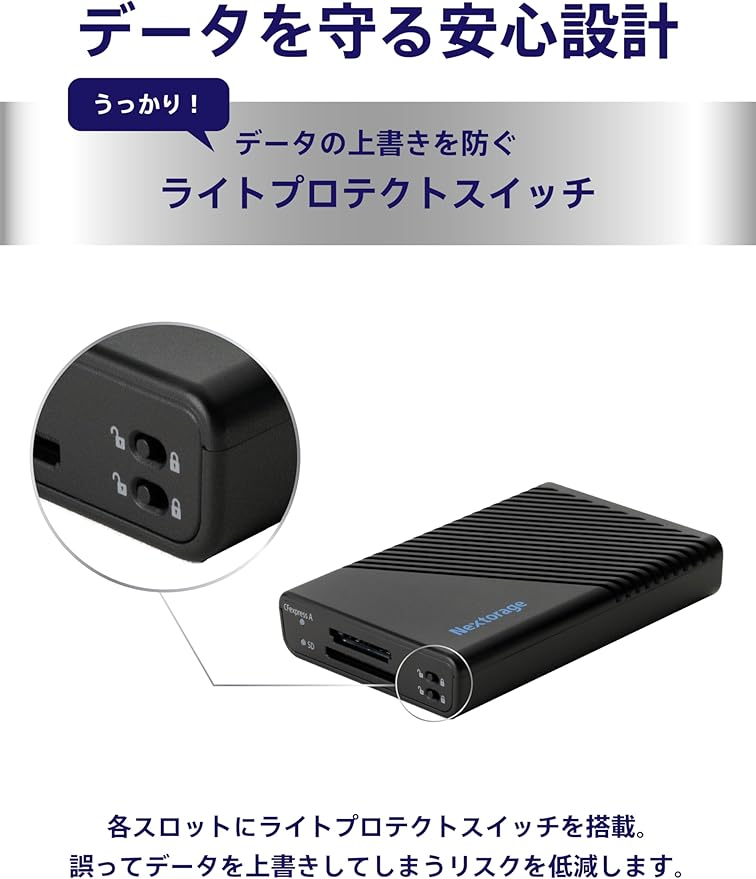 ライトプロテクトスイッチ搭載:各スロットにライトプロテクトスイッチを搭載し、誤ってデータを上書きしてしまう「うっかりミス」を防止します。
