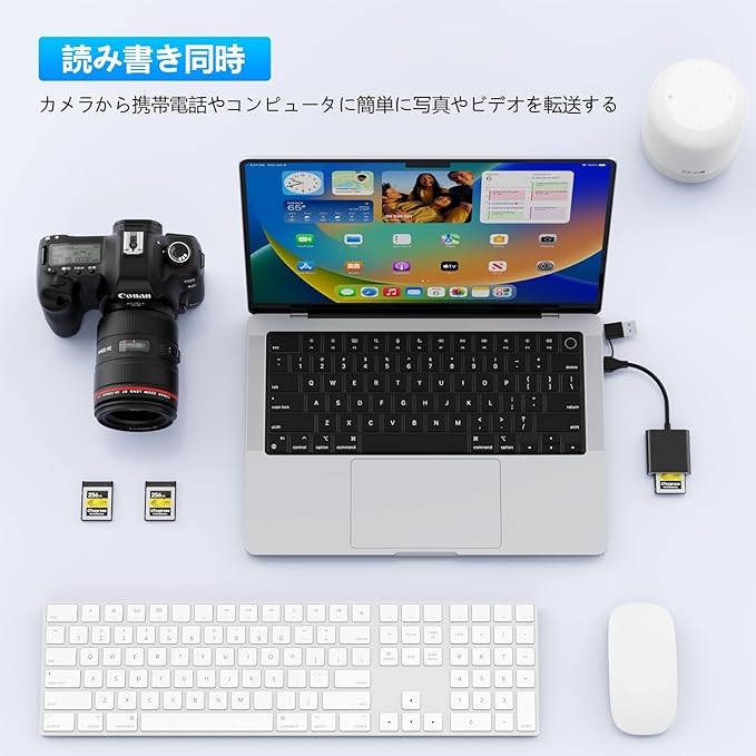 【幅広い互換性】このCFexpressカードリーダーはWindows(XP〜11)、Mac OS、iOS、Androidなど主要なシステムに対応。USB-CだけでなくUSB-Aポートでも使用でき、ノートPCやデスクトップ、スマートフォン、タブレットなど幅広いデバイスで安定した接続を実現します。