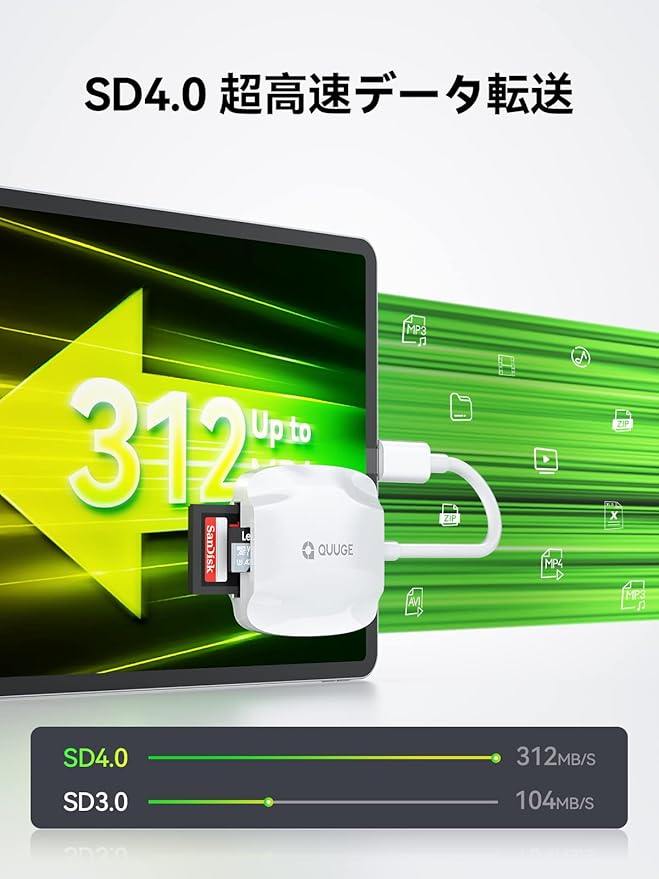 「312MB/Sデータ転送」SD/TF 4.0に準拠し、本SDカードリーダー Type-C は最大312MB/Sの高速データ転送をサポートします。最大2TBのUHS-II、UHS-I、SD、Micro SD、Micro SDHC、Micro SDXC、T-Flash、SDHC、SDXCなどの多彩なメディアカードに対応します。