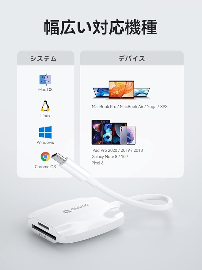 「OTG機能に対応」本USB-C 3.2 Gen 1 カードリーダーはUSB Type C 3.2コネクタを搭載したiPad Pro 2018、Macbook、iMac、Google Pixel、 Dell XPSなどのPCに適用するだけではなく、OTG機能付きの Androidスマホ、タブレットにも対応します。