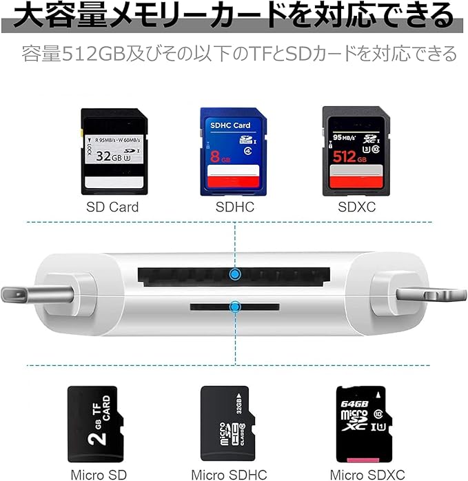 大容量メモリカードを対応できる ---- 容量512GB及びその以下のMicro SDとSDカードを対応できる、さまざまな形式のカードの読み取りと書き込みをサポートします。大容量ファイルデータの転送にとって、転送速度が一番重要である。iOS機器場合の転送でも、25MB/Sに達することができます(一般製品のスピードは14 m/sしかないです)