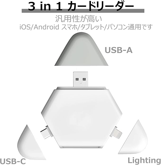 三つの機能が一つになる --- Lighting、 USB-A と USB-C計3端子搭載、iOS機器(iPad & iphone) 、Android スマホ(OTG機能付きUSB-C端子)、ノートパソコン(ipad pro、MacbookなどUSB-AやUSB-C端子)対応し、iOS Windows OS Linux Mac OS Android 各種システムに対応、仕事と生活の中で異なっている設備の接続の需要を満たします