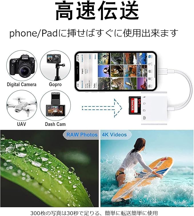 ●【双方向データ転送】メモリーカードやデジタルカメラからPadやPhoneに簡単に写真やビデオを取り込めます。iPa-dやiPhon-eにある写真もメモリーカードに保存できます。写真、ビデオ、音楽以外もWord、PPT、PDF、Excleなどの資料ファイルを自由自在に転送できます。「※SDカードなどへの書き込みはIOS 13以降のシステムのみ対応しますので、予めご了承ください。」