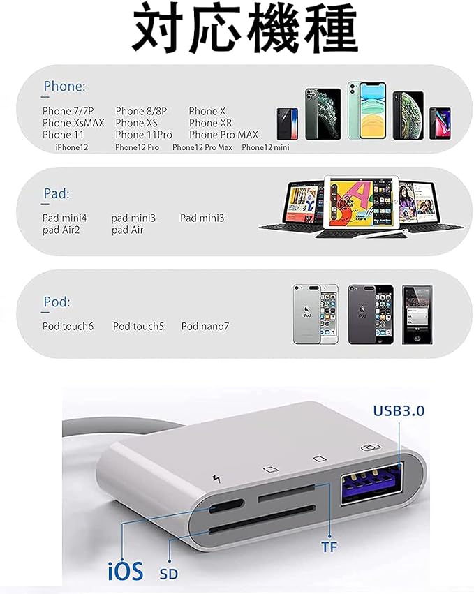 ●【対応機種】Phone 14 /14 Pro /14 Plus /14 Pro Max /13 /13 Pro /13 Pro Max /13 Mini /12 /12 Pro /12 Pro Max /11 /11 Pro /11 Pro Max /XS /XR /XS Max /X /Phone 8 /8 Plus /7 /7 Plus /Pad などと互換性があります。IOSバージョンはIOS 9.2以降に対応します。「※iOS9.2-12.4の場合、サポートされていないファイルとデバイス:Word、Excle、PPT、PDF、MP3、MP4、非デジタルカメラで撮影されたJPGおよびMP4ファイル、非デジタルカメラで撮影されたDCIMフォルダ、ハードディスクドライブ、マウス。」