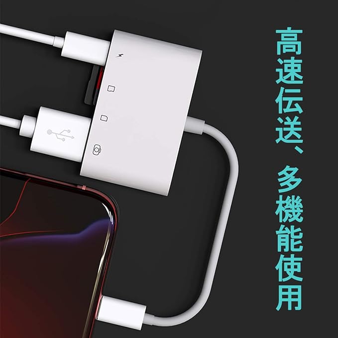 ●【iOS専用カードリーダー&充電機能】IOS 対応の四つスロット:SDカードスロット 1、マイクロSDカードスロット 1、USB-Aポート(カメラを接続可) 1、充電用IOSコネクタメス 1。このSD カードリーダーは、Phone/Pad専用 カードリーダーです。この製品を使用すると、写真やビデオをPhone / Padに簡単に転送できます。データの転送中に簡単に充電することもできます。電力不足の問題がありません。