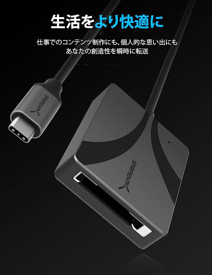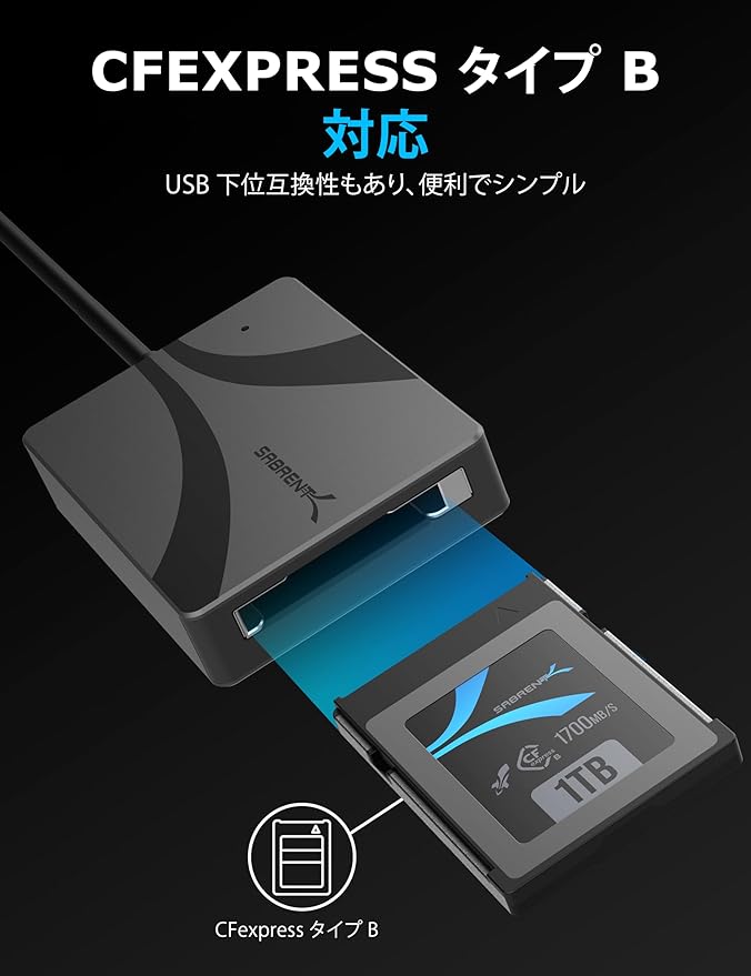 素早くて簡単:Sabrent の USB タイプ C CFexpress タイプ B カードリーダー (CR-CFXB) は、CFexpress タイプ B メモリーカードに対応し、USB-C ホストポート経由で最適に読 み取ることができます。これにより、編集やバックアップのためにコンテンツを迅速か つ容易に転送することができます。