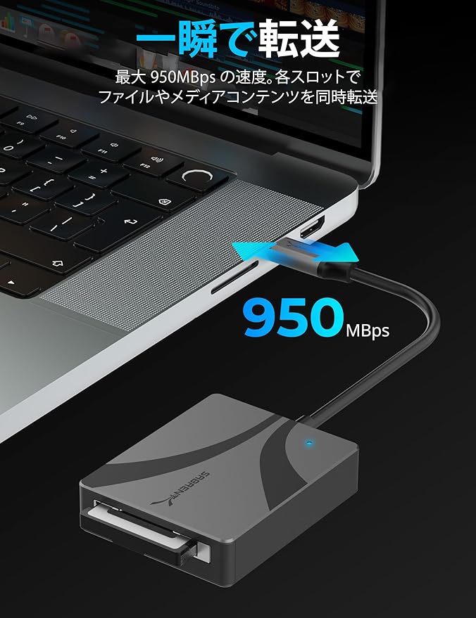 一瞬で:このカードリーダーは、互換性とパフォーマンスのために BOT と UASP マスス トレージの両方の仕様に対応しています。内蔵の 15cm(6 インチ)USB タイプ C ケーブ ルは、最大 10Gbps(USB 3.2 Gen2)で接続し、最大 950MBps の転送が可能です。