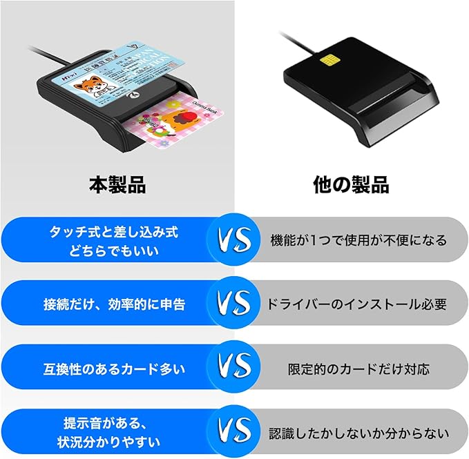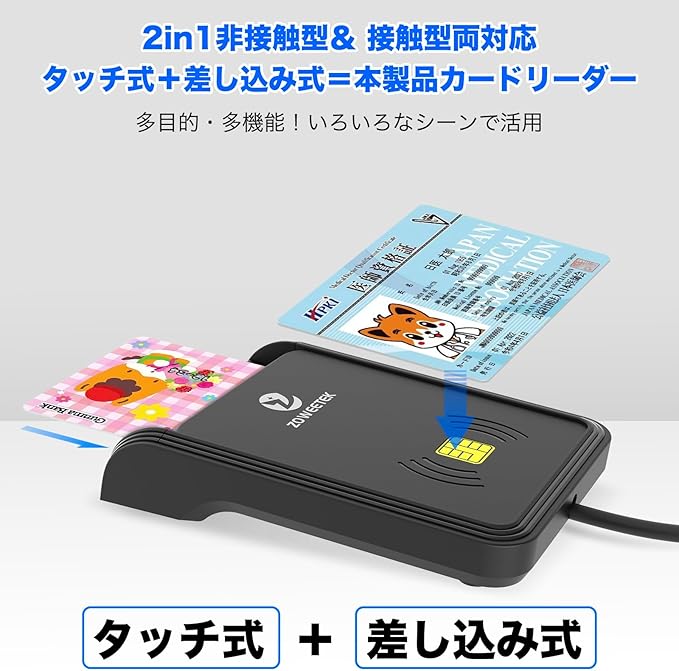 非接触&接触型:タッチ式と差し込みの2 種類のカード挿入が可能で、カードリーダーはマイナンバーカードなどに限らず、車検証など様々なカードに対応できる。新発行デザインで一台多目的にカードを読み取りがもっと効率的、便利になりました。ご注意:ブルートゥースには対応していません