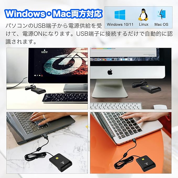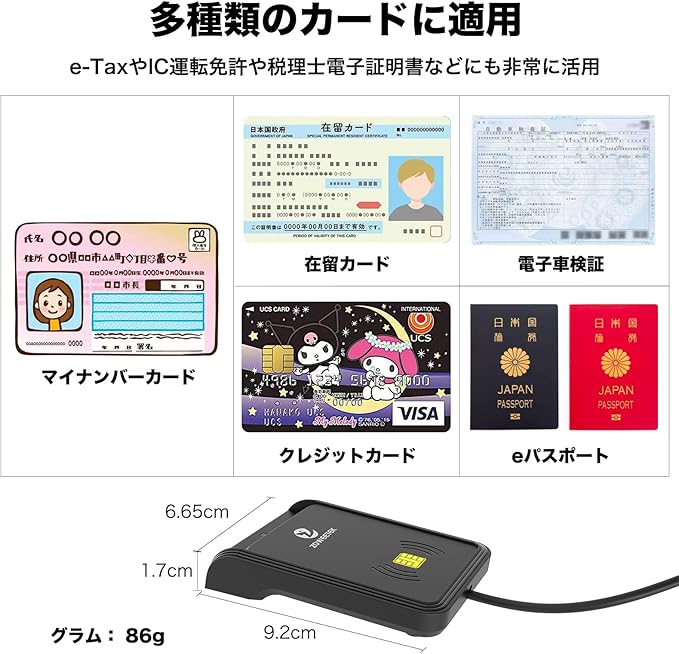 広い対応性:マイナンバーカード対応、電子車検証、マイナポータル、IC免許証、eパスポート、在留カード、税理士用電子証明書など各種行政手続き、いろいろなスマートカードに活用です