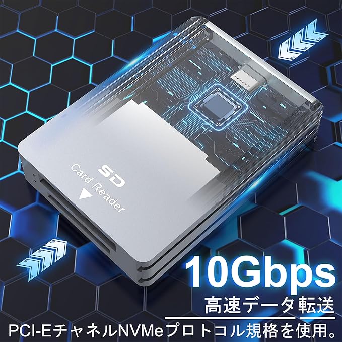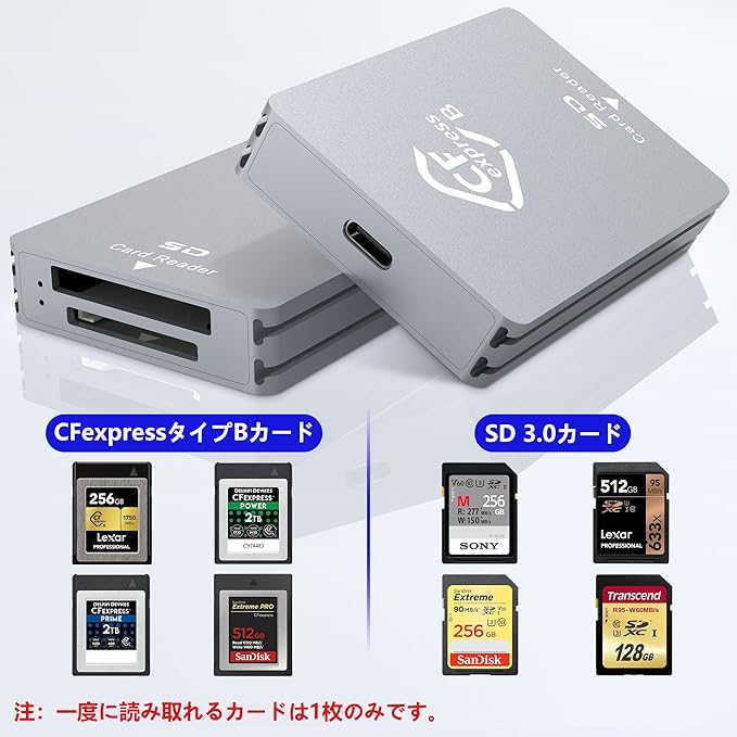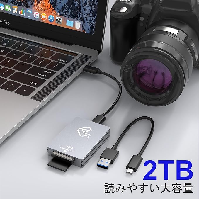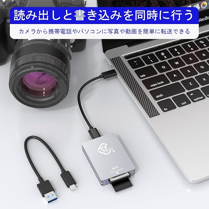 【2-in-1 CFexpress タイプB/SD カードリーダー】CFexpress type-b カードリーダーのデータ転送に対応したプロ仕様のカードリーダー CFexpress タイプbです。 超高速10Gbpsの高速USB 3.2 Gen2データ転送で、高解像度の画像や録画映像をより速く、より効率的にコンピュータに転送できます。 このCFexpressカードリーダーは、SDスロットを追加し、外出中のフォトグラファーやビデオグラファーに最適な2in1オプションとなっています。