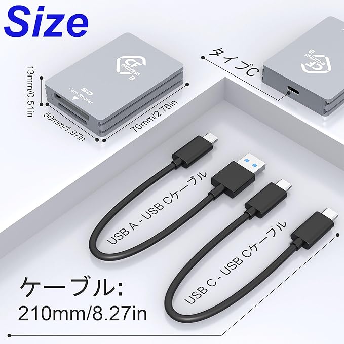 【デュアルケーブル設計・携帯性】このUSB-C CFexpress タイプB カードリーダーにはUSB C to USB CケーブルとUSB C to USB Aケーブルが付属しています。 デュアルケーブル設計により、USB Cデバイスだけでなく、USB Aデバイスも使用することができます。 手のひらサイズのスリムなボディデザインで、旅行先でも気軽に持ち運べるCFexpressカードリーダータイプaです。