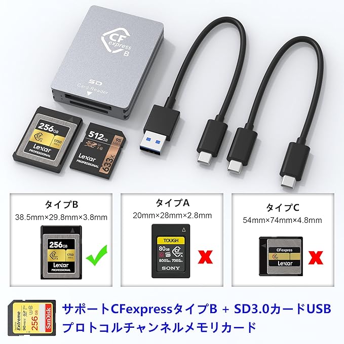 CFexpress Type B SD カードリーダー USB C、デュアルスロットUSB 3.2 10Gbps CFexpress Type Bカードリーダー Android/Windows/Mac OS/Linux対応、USB C - USB/USB Aケーブル付き アルミニウム製 | KAZESHOP