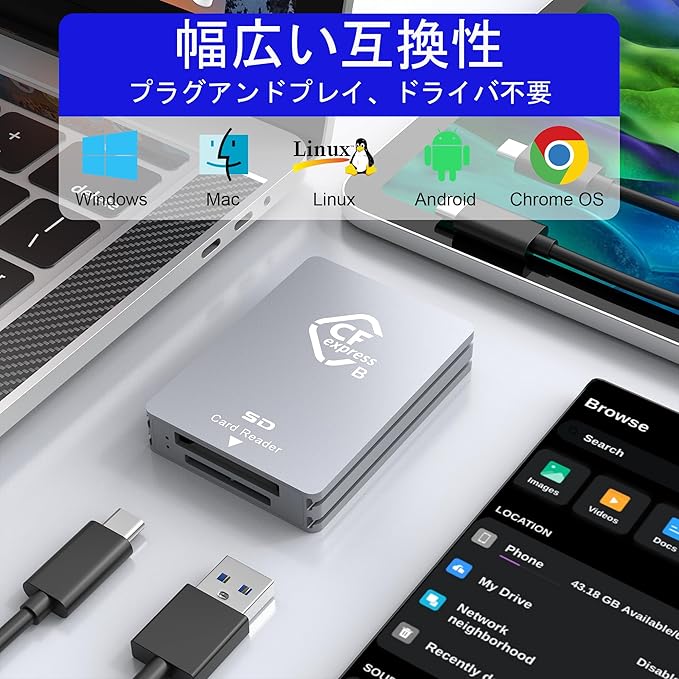 【幅広い互換性】このCFexpress/SDカードリーダーは、CFexpressとSDカードに強い互換性があり、32GB、64GB、120GB、128GB、240GB、256GB、最大2TBの様々な容量に対応しています。 Windows XP / Vista / 7/8 / 8.1 / 10、Mac OS、Linux、USB Cスマートフォン、OTG機能などに対応。 ホットスワップ機能付きプラグアンドプレイ、外部電源不要、USBバスパワー駆動、カメラマンやビデオグラファーの持ち運びに便利、シンプルで便利です。
