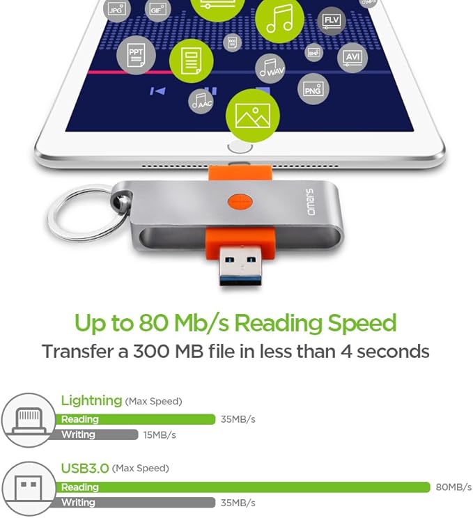 iOSデバイスにおける読み込み、書き込み速度は最大でそれぞれ35MB/sと15MB/s。PCにおける読み込み、書き込み速度は最大 80MB/s と35MB/sになります。専用アプリですぐにお使いいただくことができます (初回接続時にApp Storeからダウンロード、またはWiStickで検索)。