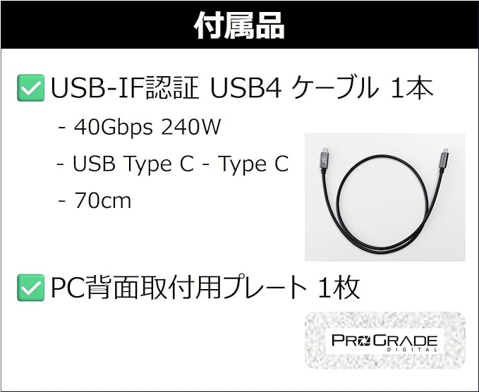✅付属品:USB-IF認証USB4ケーブル(C-C 0.7m)/PC背面取付用プレート1枚