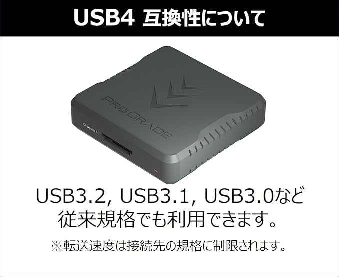 CFexpress 4.0 TYpe A対応 USB4 Gen3x2 下位互換性:CFexpress 2.0 Type Aカードにも対応 USB3.2/3.1/3.0/2.0にも対応