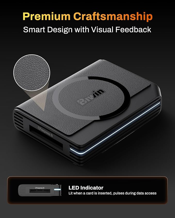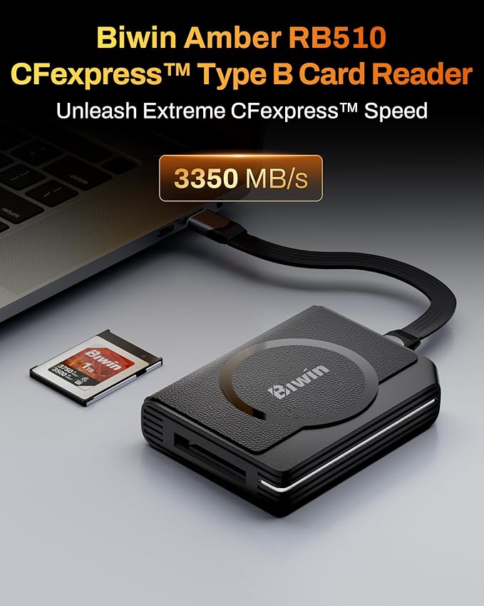Amber RB510は、CFexpress Type Bメモリーカード専用に設計された高性能カードリーダーです。USB4.0インターフェースを採用し、最大40Gbpsの広帯域を確保。Biwin製CFexpress Type Bカード「CB500」との併用により、最大3350MB/sの読取速度を実現し、4K・8K動画やRAW画像など大容量ファイルの高速転送に対応します。 本体には高効率コントローラを搭載し、放熱フィンを備えた筐体設計と相まって、連続使用時でも安定したパフォーマンスを維持。映像制作や報道現場など、長時間にわたる高負荷環境でも信頼性の高い運用を可能にします。 さらに、動作状況を視覚的に把握できるインジケーターLEDを装備し、ドライバ不要のプラグアンドプレイおよびホットスワップにも対応。撮影現場から編集スタジオまで、プロフェッショナルのワークフローを効率的にサポートするソリューションです。