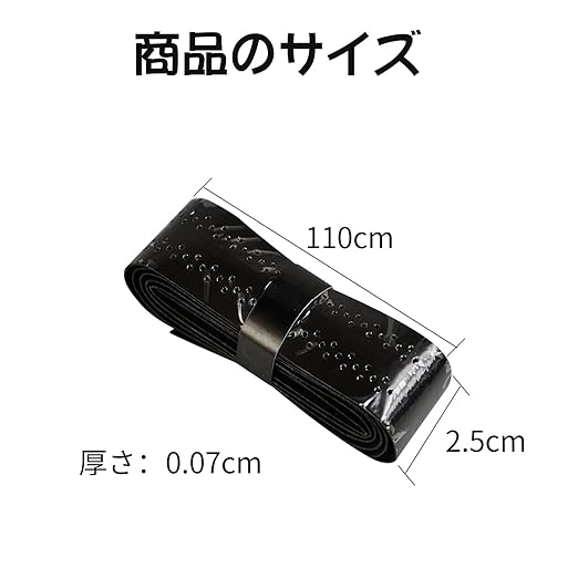 【テニス グリップテープ寸法】 1,100mm x 25mm x 0.7mm (長さ x 幅 x 厚さ)、重量: 10g。