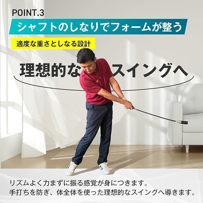 ✅【シャフトのしなりでフォームが整う】適度な重さとしなる設計を採用。リズムよく力まずに振る感覚が身につきます。手打ちを防ぎ、体全体を使った理想的なスイングへ導きます。