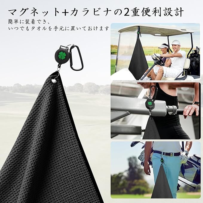 【マグネット+カラビナの2重便利設計】:ゴルフカートやアイアンヘッドに簡単に吸着できるマグネット、キャディーバッグに装着可能なカラビナを両方付属。プレー中にタオルを手元に固定でき、紛失や取り出しの手間を省き、スムーズなプレーをサポートします。