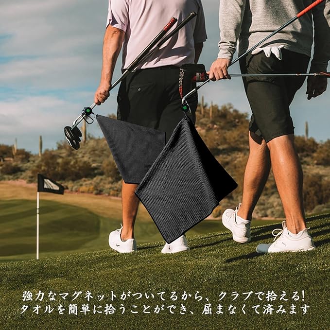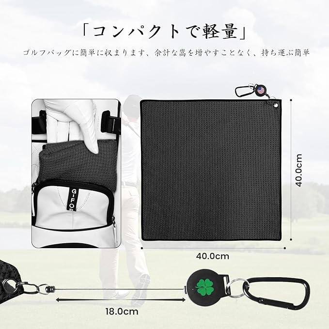 【40cm 40cmコンパクトサイズ、持ち運びに最適】:40cm 40cmの適度なサイズで、クラブやボールを拭くのに十分な面積を確保しつつ、キャディーバッグの側ポケットにも収まりやすく、持ち運び時に邪魔になることがなく、プレー場での使用に最適化されています。